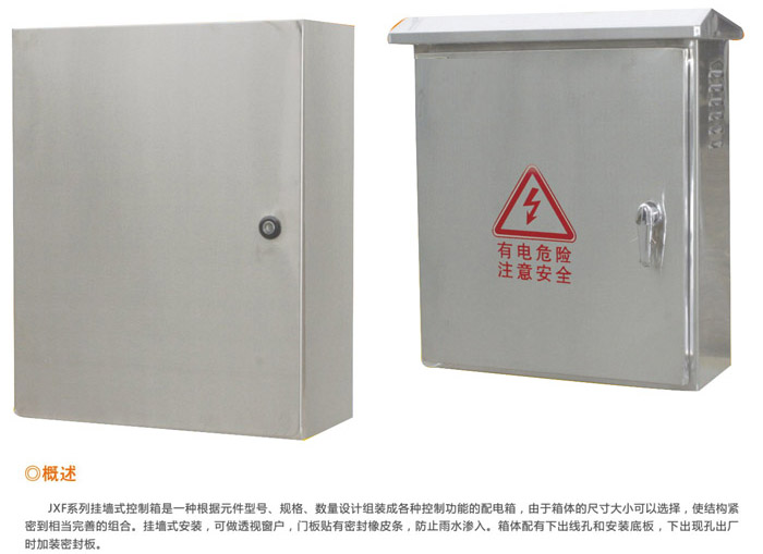 產(chǎn)品概述: JXF/JFF系列不銹鋼配電箱是一種根據(jù)元件型號(hào)、規(guī)格、數(shù)量設(shè)計(jì)組裝成各種控制功能的配電箱,由于箱體的尺寸大小可任意選擇,使結(jié)構(gòu)緊密到相當(dāng)完善的組合。掛墻式安裝,可做透視窗,門板貼有密封橡皮條,防止雨水的滲入。箱體配有下進(jìn)出線孔和安裝底板。