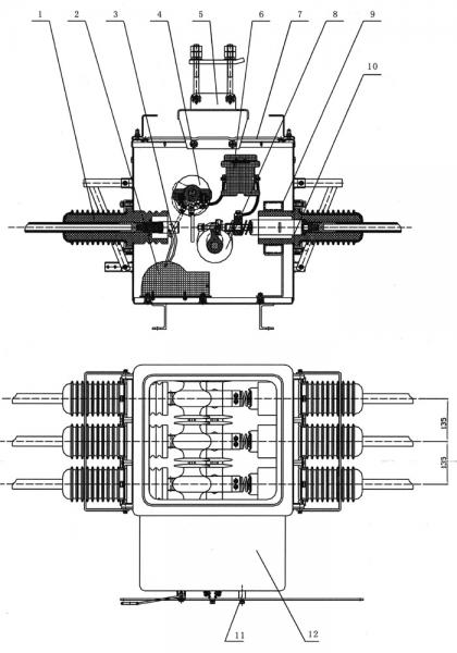 10 滅弧室端瓷套電纜組裝 11 操作手柄 12 操作機(jī)構(gòu)