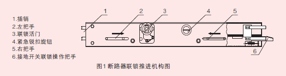 7.2.2斷路器的進柜:把斷路器手車的聯(lián)鎖推進機構(gòu)(如圖3)的活門(序3)關(guān)好,拉動其左、右把手(序2和序5)向內(nèi)收縮。并推進斷路器手車沿著導軌進入柜體,直到其插鎖(序1)和柜體的定位孔相對應時,放開左右把手,使斷路器手車固定在柜體內(nèi)。并把接地開關(guān)聯(lián)鎖操作把手(序6)向外拔,使其處于插入位置。